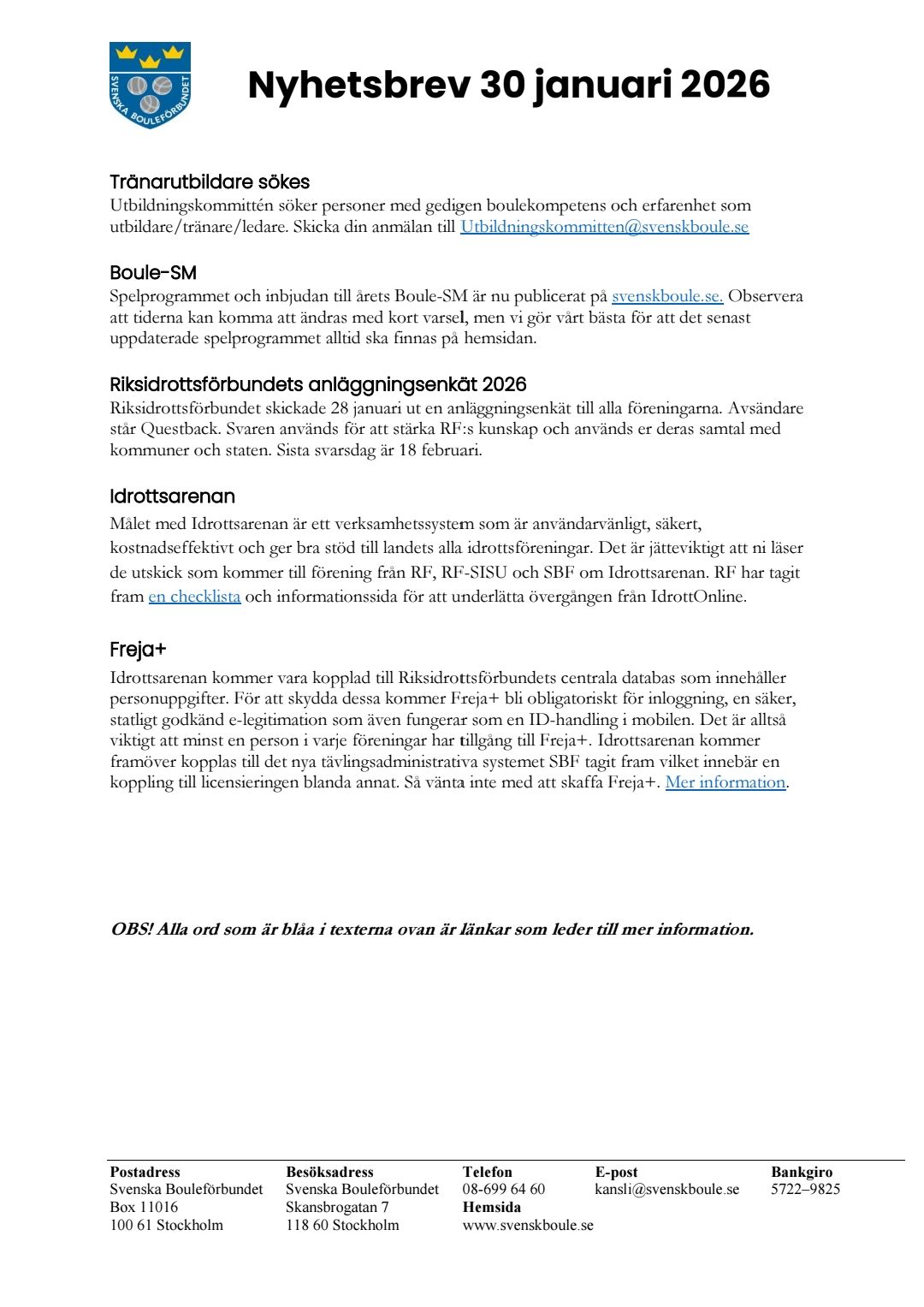 Nyhetsbrev från Svenska Bouleförbundet 2026-01-30 i Allmänt Prenumerera på nyheter Genom att prenumerera på nyheter kommer du att få ett e-postmeddelande varje gång Bouleklubben Esplanad publicerar en nyhet. Ange din e-postadress: Genom att klicka på "Prenumerera" godkänner du vår integritetspolicy. Avbryt Prenumerera Du prenumererar nu på nyheter från Bouleklubben Esplanad. Vi har skickat ett bekräftelsemail till . Stäng Prenumerera via: E-post RSS Ligger också som .pdf på sidan Nyhetsbrev från förbunden